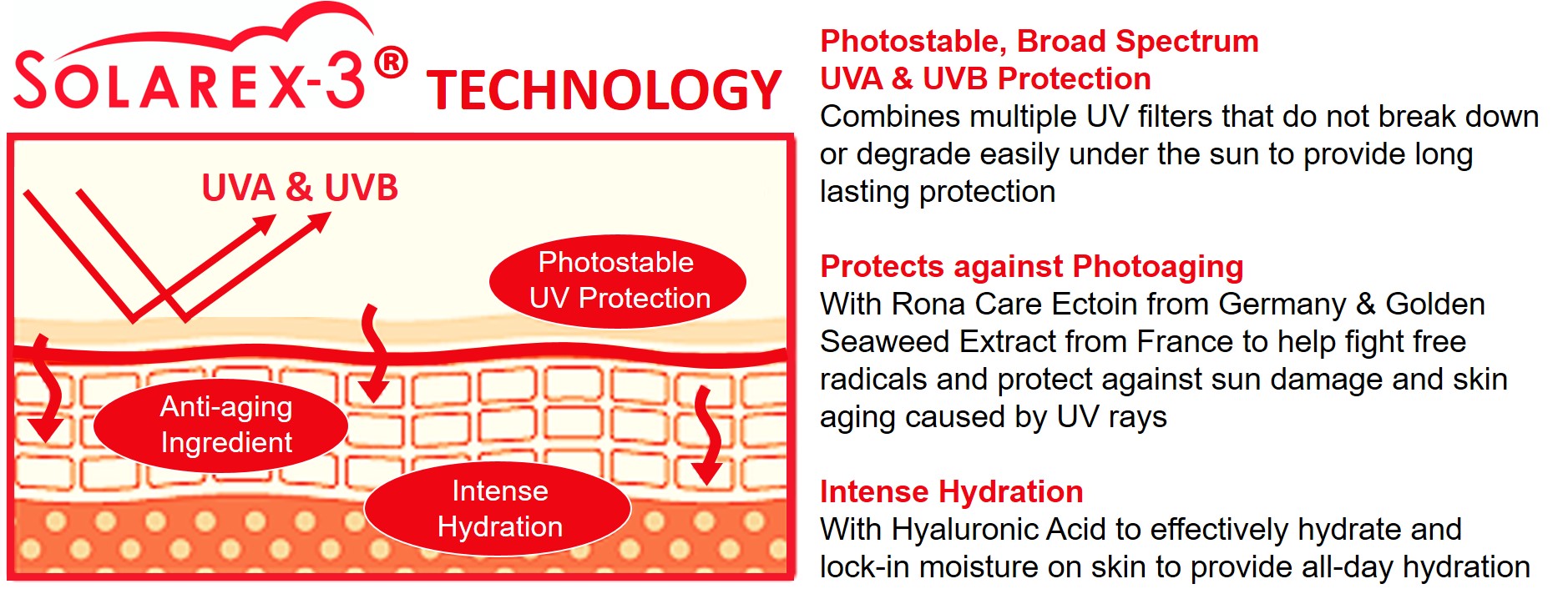 Solarex-3 technology which provides superior photo-stable protection, high moisture retention and protects against premature aging caused by UV rays